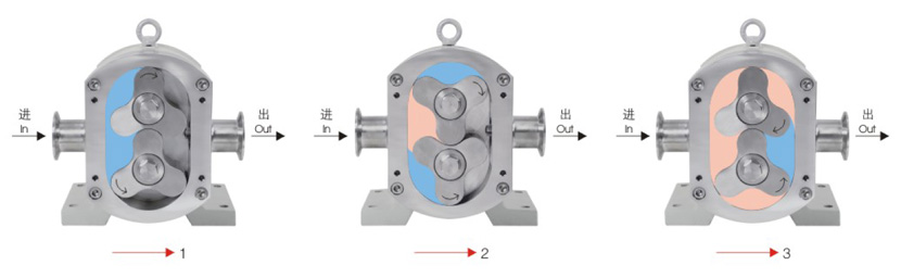 如圖所示,由于兩個轉子持續運動,介質通過了轉子順著容積流動的方向被輸送至出料口,介質被加壓從而排出。 由此可以看出,兩轉子的轉速越快,泵輸送的流量就越大,故泵流量與轉子轉速成正比。如果改變兩個轉子的轉動方向,則凸輪泵可以逆向運送介質,并不損壞各零件。