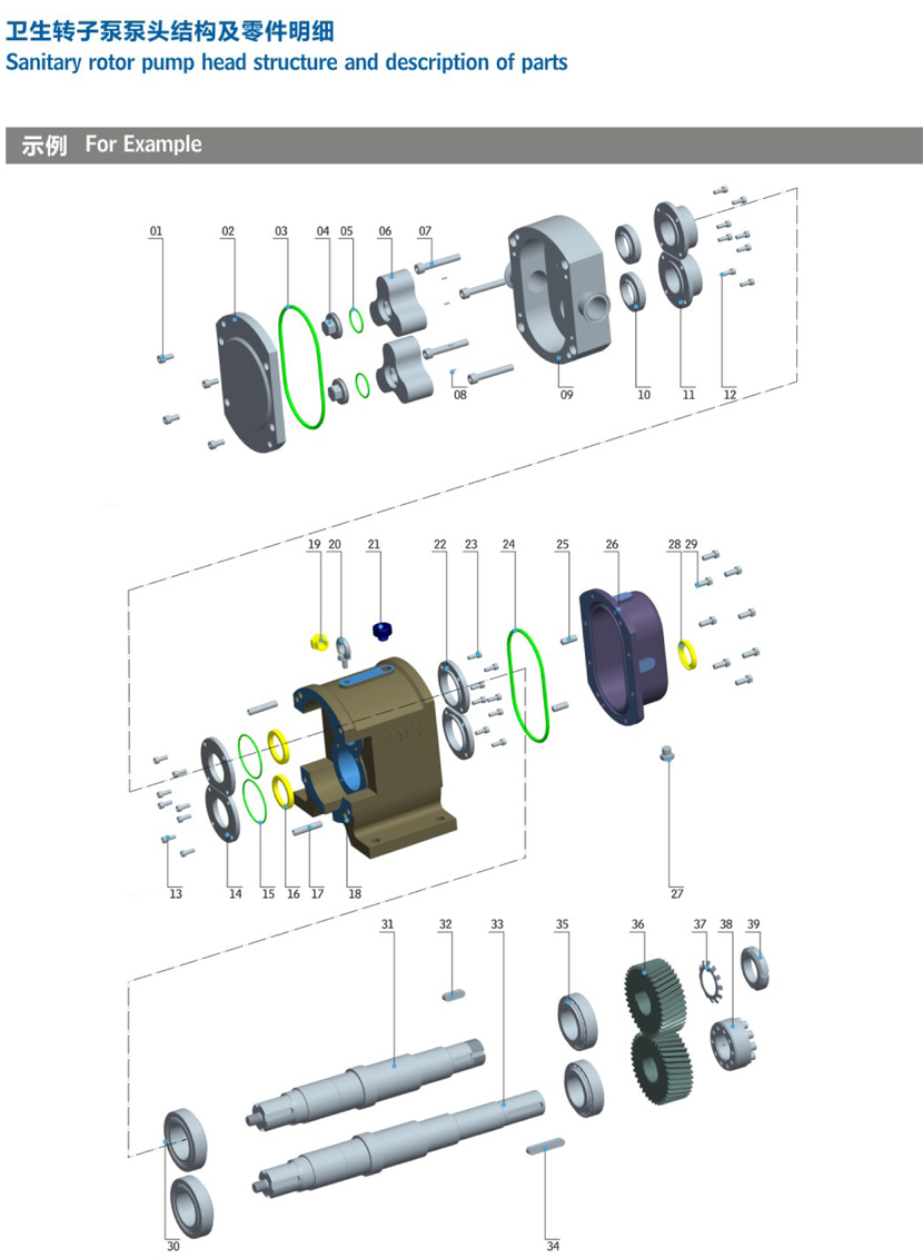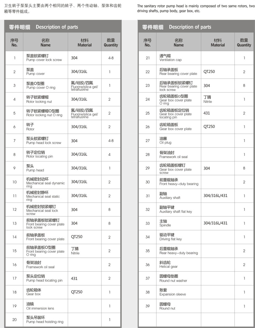 衛生轉子泵的特點: 1、衛生安全: 轉子的流線結構和泵體內腔平整光滑無殘留死角。 轉子與軸兩端有O型圈密封,有效防止物料滲入軸于軸孔的間隙。 與物料接觸的零部件,均采用符合衛生標準的不銹鋼材料制作,密封橡膠采用無毒橡膠。 泵體部分與齒輪箱部分之間有機械密封和油封,油漬不會滲透或飛濺到泵腔內部,保證介質衛生、安全的輸送。
